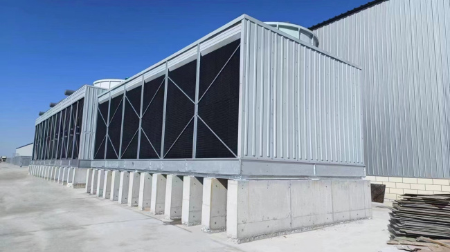 方形横流式冷却塔采用两侧进风,靠顶部的风机,使空气经由塔两侧的填料,与热水进行介质交换,湿热空气再排向塔外。填料采用两面有凸点的点波片,通过安装头使点波片粘结成整体,以提高刚性,两面的凸点还可避免直接滴水,因此提高了水膜形成能力,填料尾部设有收水措施。