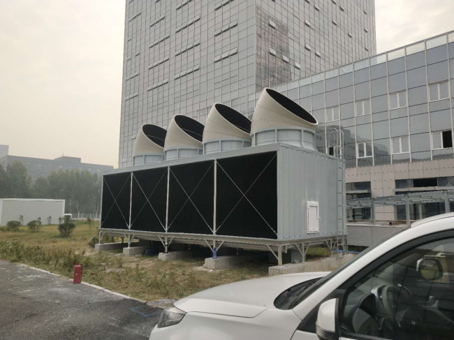 方形横流式冷却塔采用两侧进风,靠顶部的风机,使空气经由塔两侧的填料,与热水进行介质交换,湿热空气再排向塔外。填料采用两面有凸点的点波片,通过安装头使点波片粘结成整体,以提高刚性,两面的凸点还可避免直接滴水,因此提高了水膜形成能力,填料尾部设有收水措施。